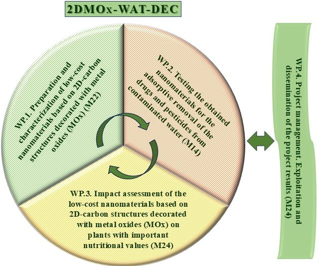 The project’s general objective is to develop low-cost 2D-carbon materials decorated with metal oxides (MOx) for the adsorptive removal of drugs and pesticides from contaminated water and the newly developed nanomaterials’ impact assessment on plants. Thus, the general objective will be achieved by performing the following specific objectives (SO):