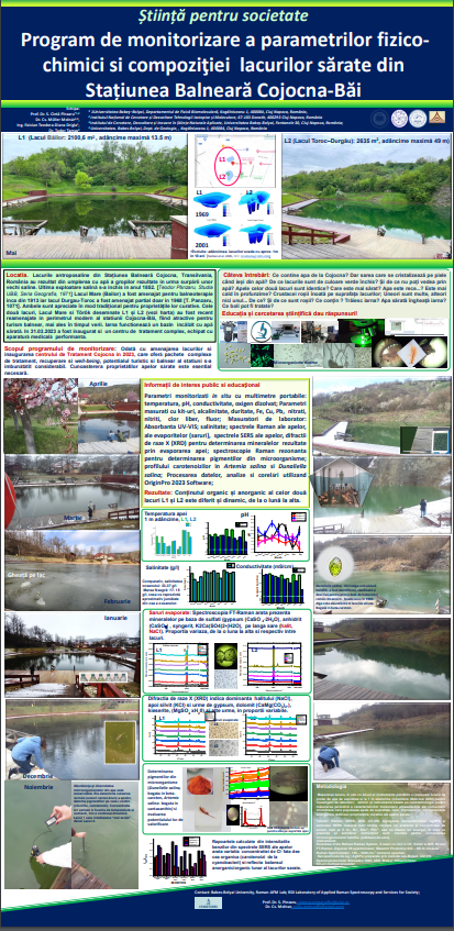 4. Müller Molnár, Teodora-Diana Drigla, S. Cintă Pînzaru, Nanotechnology to monitor the SERS response of SALT LAKES FROM Cojocna BALNEARY RESORT, Transylvania, România, 17th International Summer Schools on N&N, OE & Nanomedicine (ISSON23),1-8 July 2023, Thessaloniki, Greece.