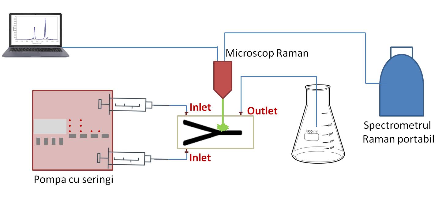 Figura 3 prezintă sistemul microfluidic integrat în configurația experimentală.2.2. Testarea dispozitivului experimental și îmbunătățirea parametrilor săi tehnici (A3) 2.2.1 Sinteza spotului de argint În prepararea substratului amplificator SERS am folosit o pompă de injecție care permite injectarea simultană, cu același debit, a azotatul de argint (AgNO3) și citratul de sodiu (Na) (Figura 4), substratul fiind preparat în teriorul canalului din celula microfluidică.