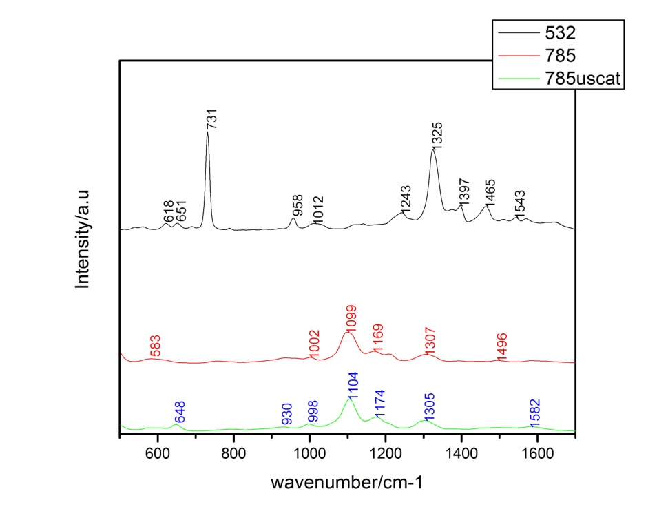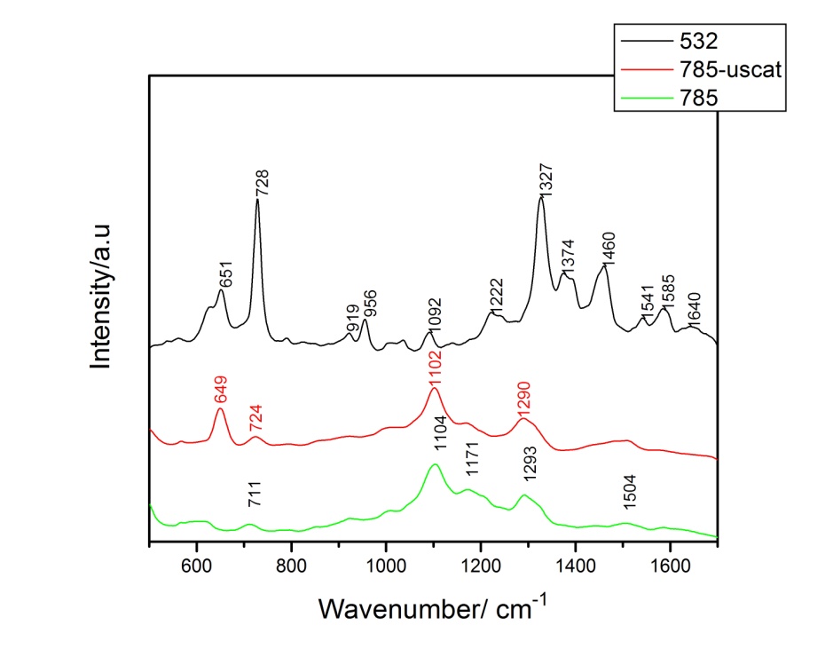 Figura 8. Spectrele SERS medii ale probelor S. aureus, cu diferite linii laser.