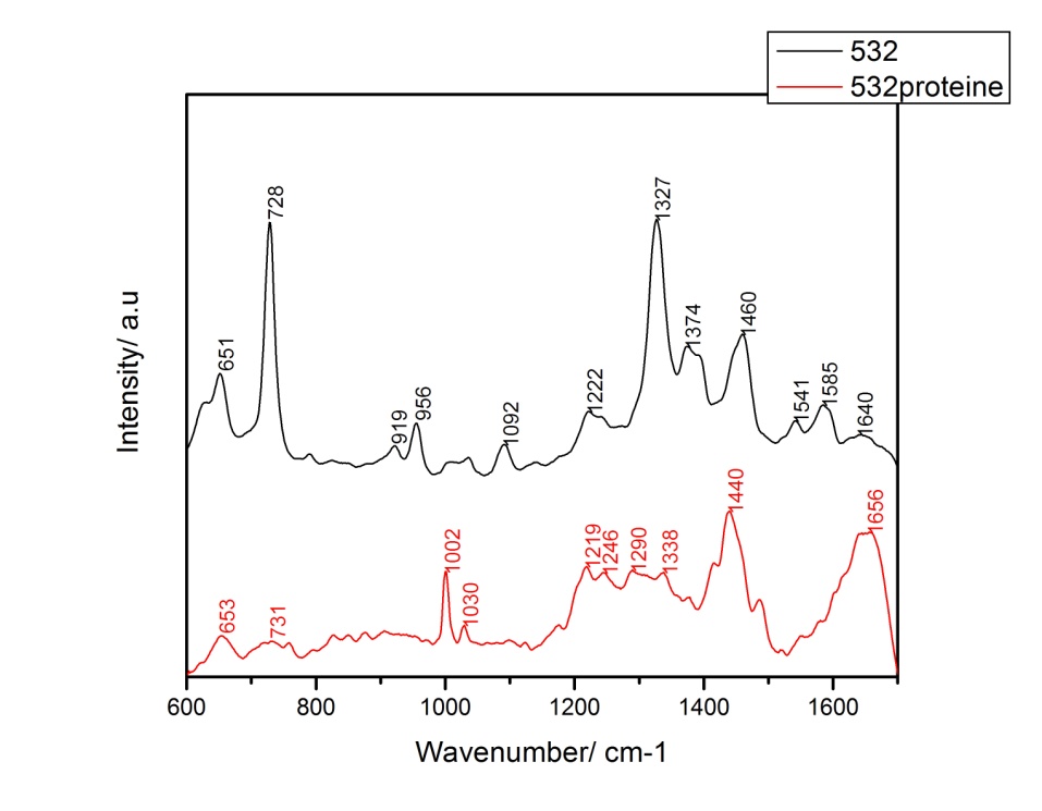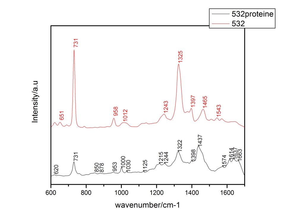 Figura 7. Spectrele SERS medii ale probelor de E. coli înainte (negru) și după adăugarea de KI (roșu).