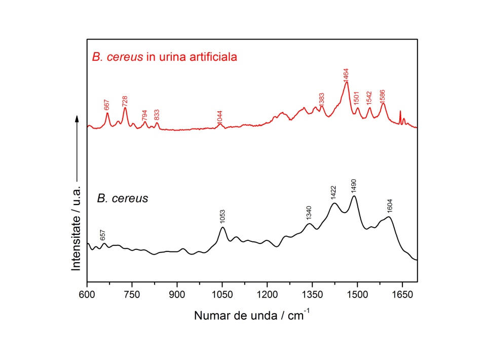 Figura 10. Spectrele SERS ale bacteriei B. cereus spălate (jos) și a probei de urină artificială contaminată cu B. cereus. (sus).