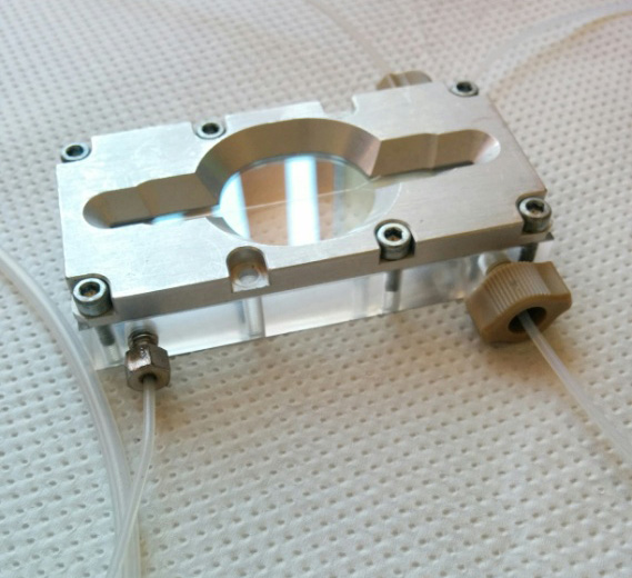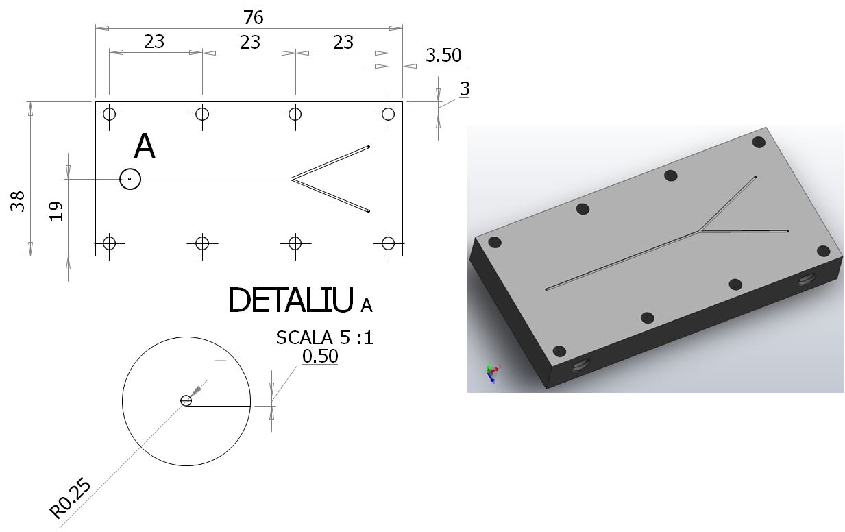 Figura 2. (a) Desen tehnic și reprezentarea 3D a celulei microfluidice. (b) Celula microfluidică.