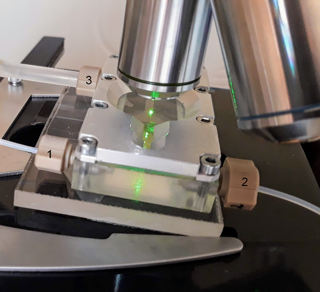 2.1. Construirea dispozitivului experimental și testarea lui / îmbunătățirea parametrilor săi tehnici. (Pachet de lucru WP1, continuare din 2017) (A3) În cadrul activității A1.3 din Etapa 1 s-a stabilit designul și dimensiunile celulei microfluidice și au fost prezentate schematic. CO împreună cu P1 au stabilit că fabricarea canalelor microfluidice din PMMA va deservi cu succes experimentelor cu bacterii Gram-pozitive și Gram-negative, fără a afecta viabilitatea acestora. Prezentarea schematică a dispozitivului experimental și a modului de realizare a experimentelor sunt evidențiate în Figura 1.