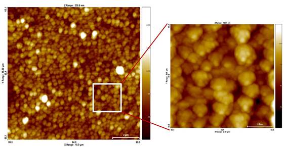 Figura 5. Topografia AFM obținută pentru spotul de Ag. (stanga) Imaginea 2D-AFM a spotului pe o suprafață de 10 μm × 10 μm; (dreapta) Imaginea 2D-AFM a spotului pe o suprafață de 2 μm × 2 μm; 2.3. Optimizarea detecției SERS cu sistemul de curgere microfluidic nou dezvoltat, folosind microscopul Raman convențional (A3) Au fost analizate prin SERS două tipuri de bacterii: Escherichia coli (E. coli) – bacterie Gram-negativă și Streptoccocus aureus (S. aureus) – bacteria Gram-pozitivă. Pentru achiziționarea spectrelor SERS, s-a folosit un microscop Raman Renishaw InVia echipat cu un laser NdYAG cu frecvență dublată, ce emite la 532 nm și 785 nm. Radiația laser a fost focalizată pe probă utilizând un obiectiv Leica de 5× (NA = 0,12). Puterea laserului pe probă a fost de ~ 60 mW. Timpul de achiziționare a spectrelor a fost de 16 secunde, 4 achiziții de câte 4 secunde fiecare, atât cu linia laser 532 nm cât și cu 785 nm. 2.3.1. Măsurători SERS pe probe E. coli