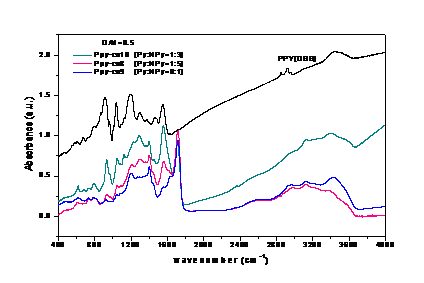 Spectrele FTIR pentru PPY dopat cu DBS si pentru copolimeri functionalizati preparati la diferite rapoarte Py:N-Py. |