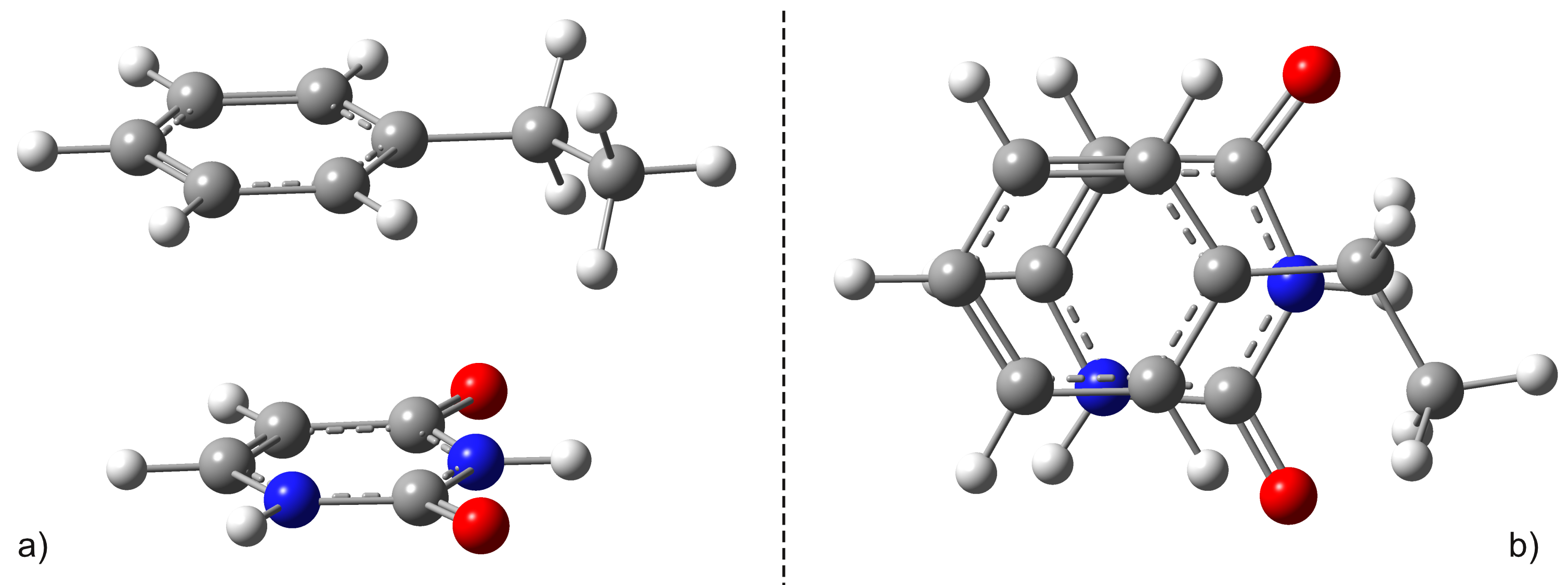 Figure 1. Side a) and top b) views of the "sandwich" (or stacking) type configuration of the uracil-benzene dimer.