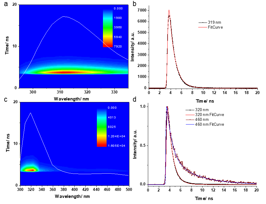 Figure 2. TCSPC 3-d data obtained from the dopamine solution in water (a) and after the addition of a small amount of NaOH (c). The overlapping white lines on the 3-d carpet represent time-integrated fluorescence emission spectra. Normalized kinetic curves recorded at the emission maximums in aqueous dopamine solution (b) and in aqueous dopamine solution after the addition of NaOH (c) together with the fit curves.