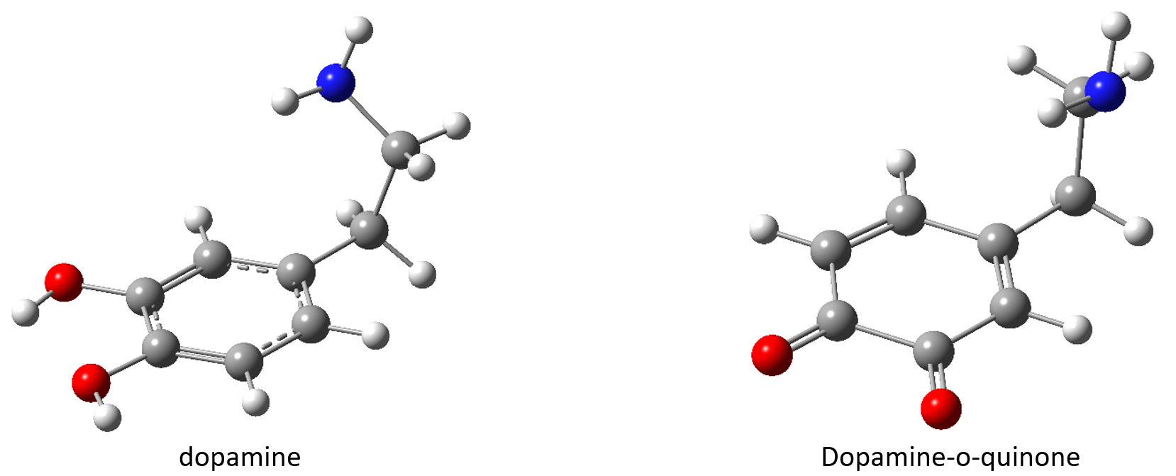 Figure 3. The equilibrium geometries of the fundamental state for the molecular structures dopamine, respectively dopamine-o-quinone obtained at the level of ωB97X-D3/ma-def2-TZVPP theory.