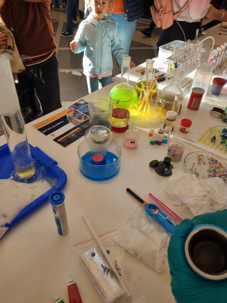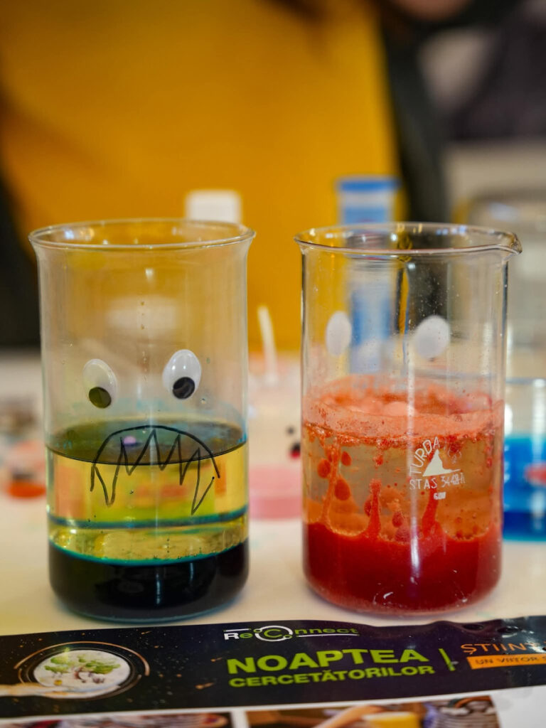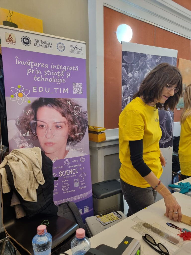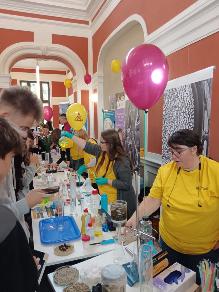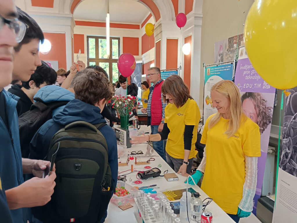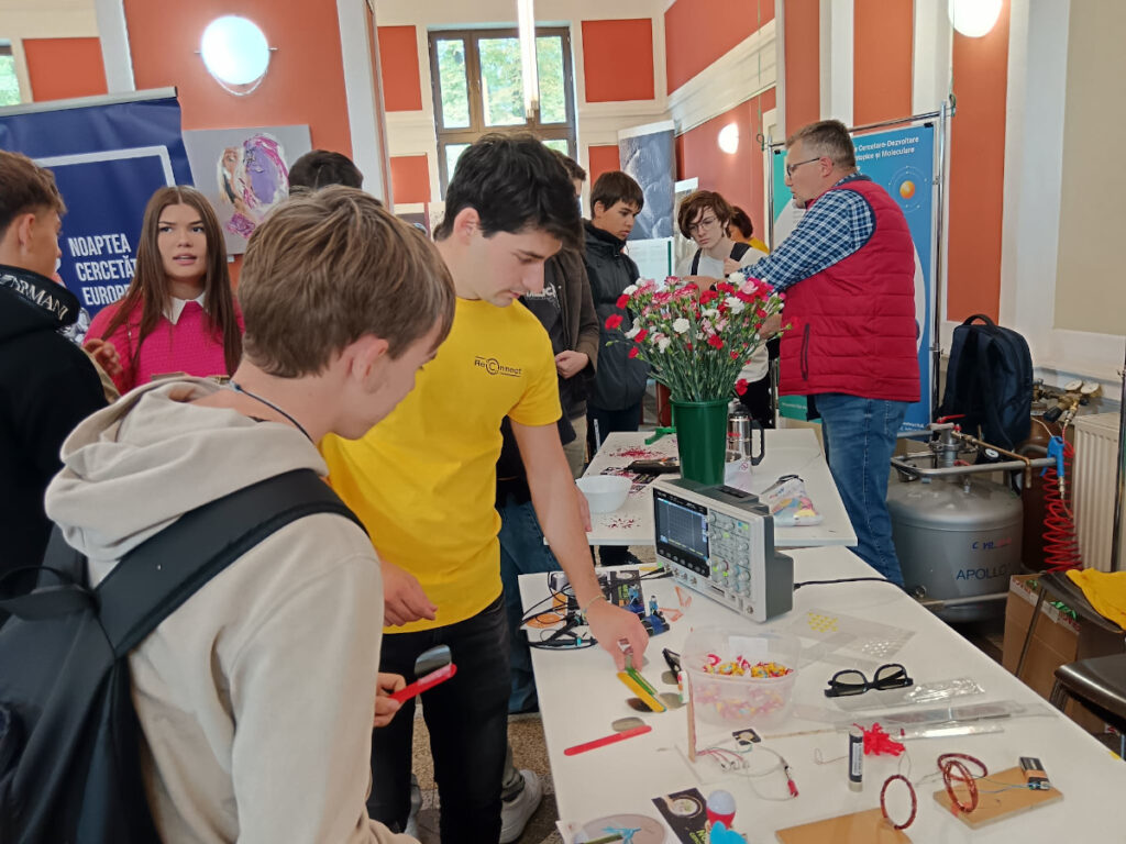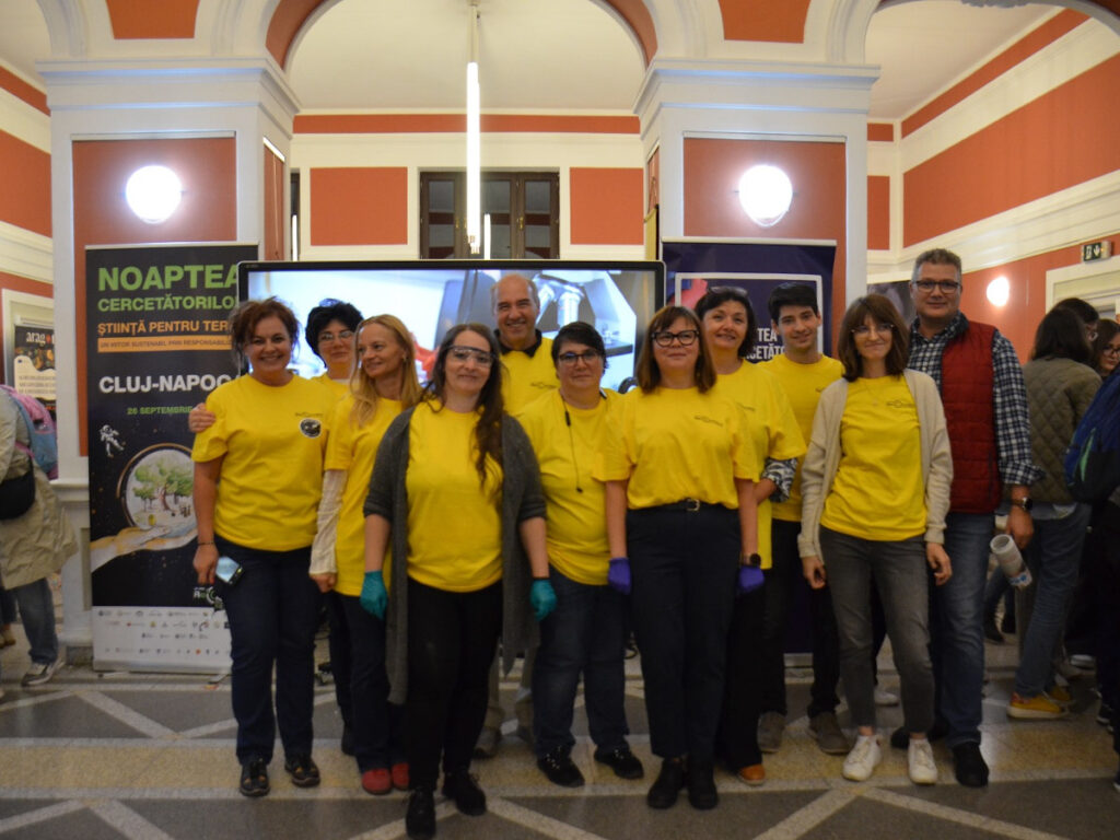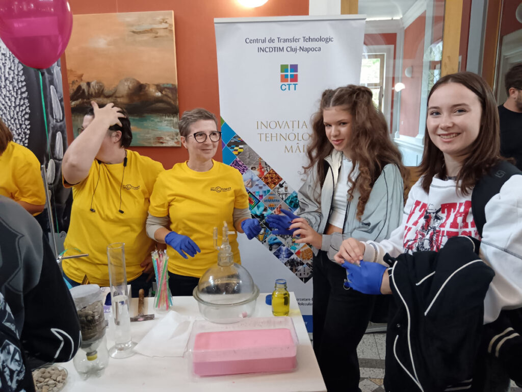 În Parcul Central, la CASINO Centrul de Cultură Urbană – Cluj-Napoca, echipa INCDTIM a răspuns pozitiv invitației de a participa la evenimentul “Noaptea Cercetătorilor ReCoNnect” (ReCoNnect 3 – Building a Community, proiect HORIZON-MSCA-2023-CITIZENS-01). Echipa INCDTIM (foto stânga) a reprezentat un pion cheie la acest eveniment, participând cu ateliere de învățare prin demonstrații și seminare interactive: experimente de purificare/curățare a apelor prin filtrare, vulcanul, apa plimbăreață-curcubeu într-un pahar; șarpele de zahăr; borcanul cu lavă; bateria din salată de fructe; zeama de varză și superputerea ei; experimente explozive cu bicarbonat; tornadă în sticlă; pasta de dinți a elefantului; crearea de circuite electrice cu baterii; experimente despre/cu polarizarea luminii, holograme prin reflexia luminii, instrumente muzicale realizate din diverse obiecte, și, nu ȋn ultimul rând, prezentarea azotului lichid.