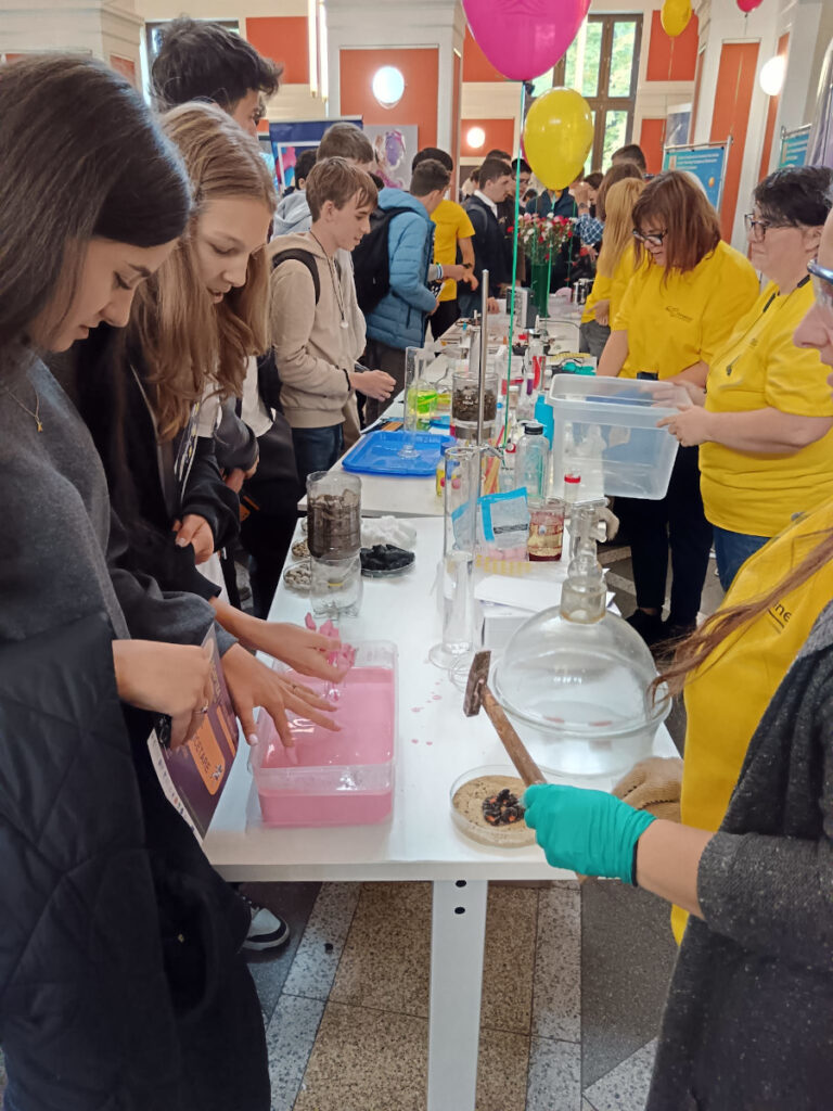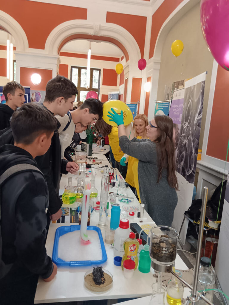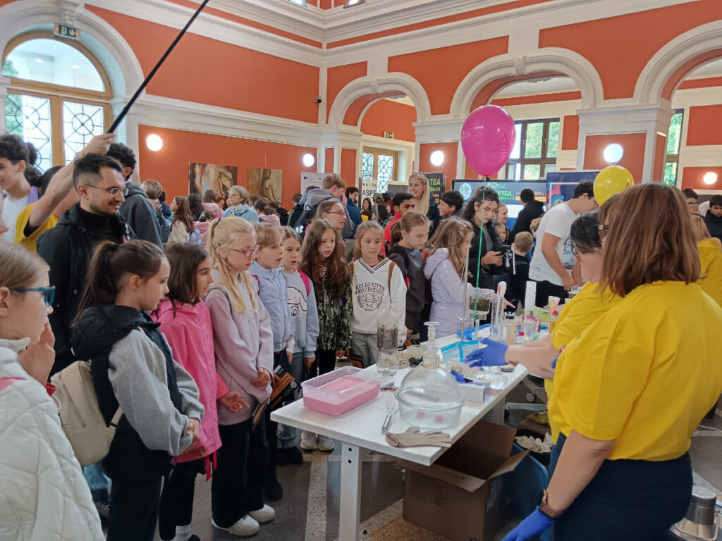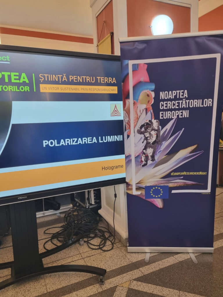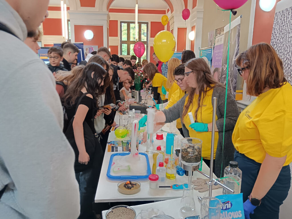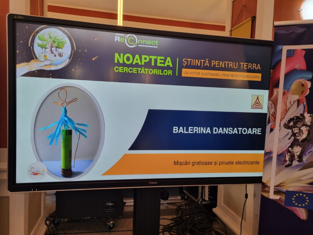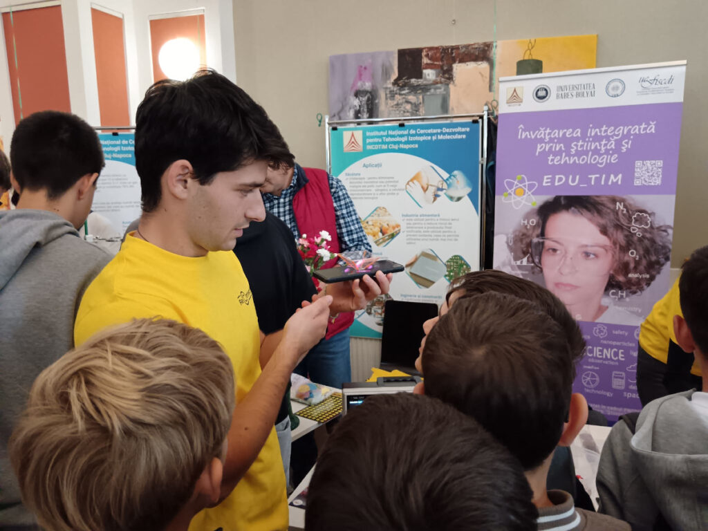 În Parcul Central, la CASINO Centrul de Cultură Urbană – Cluj-Napoca, echipa INCDTIM a răspuns pozitiv invitației de a participa la evenimentul “Noaptea Cercetătorilor ReCoNnect” (ReCoNnect 3 – Building a Community, proiect HORIZON-MSCA-2023-CITIZENS-01). Echipa INCDTIM (foto stânga) a reprezentat un pion cheie la acest eveniment, participând cu ateliere de învățare prin demonstrații și seminare interactive: experimente de purificare/curățare a apelor prin filtrare, vulcanul, apa plimbăreață-curcubeu într-un pahar; șarpele de zahăr; borcanul cu lavă; bateria din salată de fructe; zeama de varză și superputerea ei; experimente explozive cu bicarbonat; tornadă în sticlă; pasta de dinți a elefantului; crearea de circuite electrice cu baterii; experimente despre/cu polarizarea luminii, holograme prin reflexia luminii, instrumente muzicale realizate din diverse obiecte, și, nu ȋn ultimul rând, prezentarea azotului lichid.