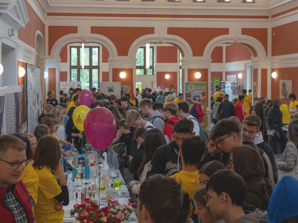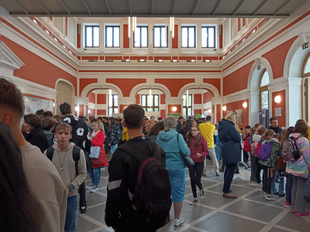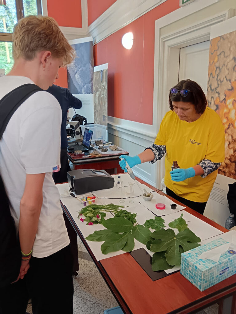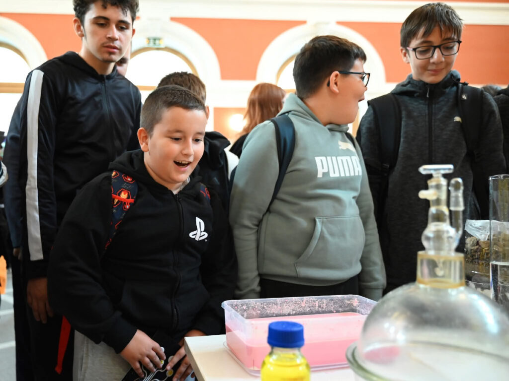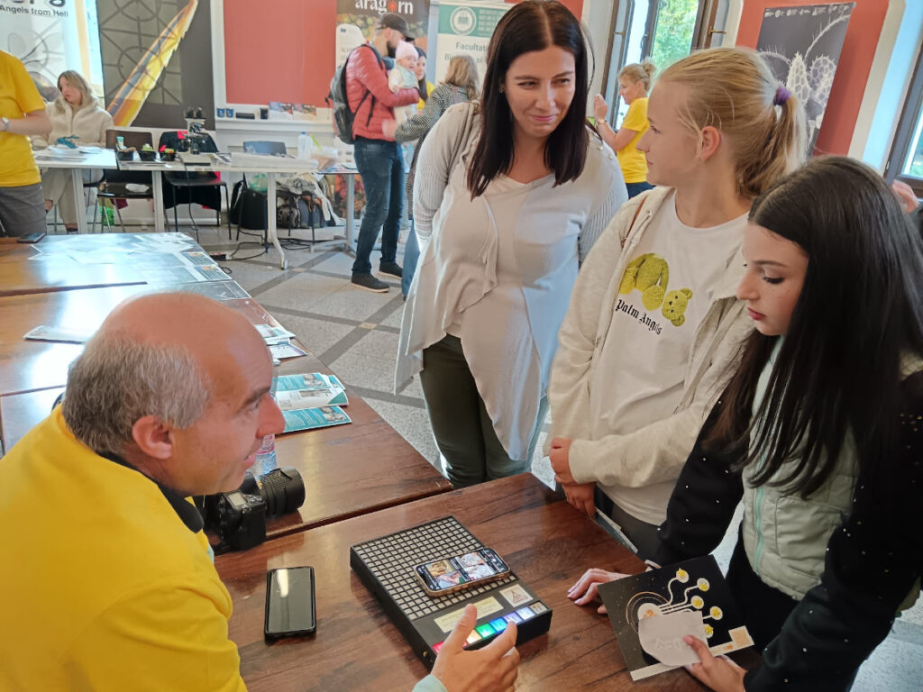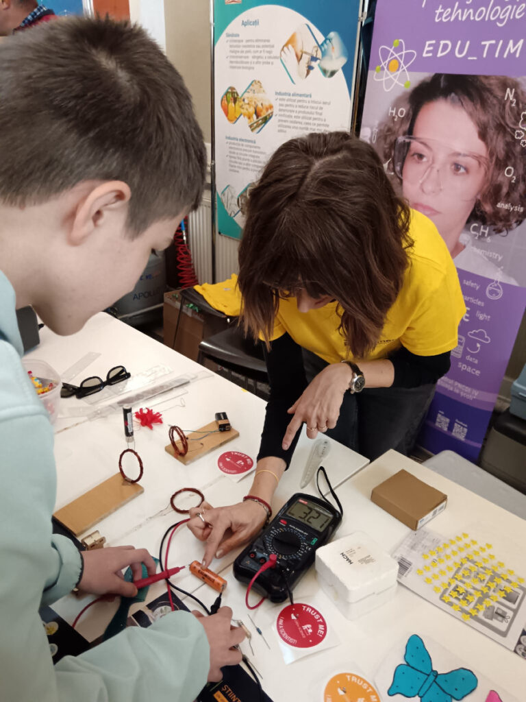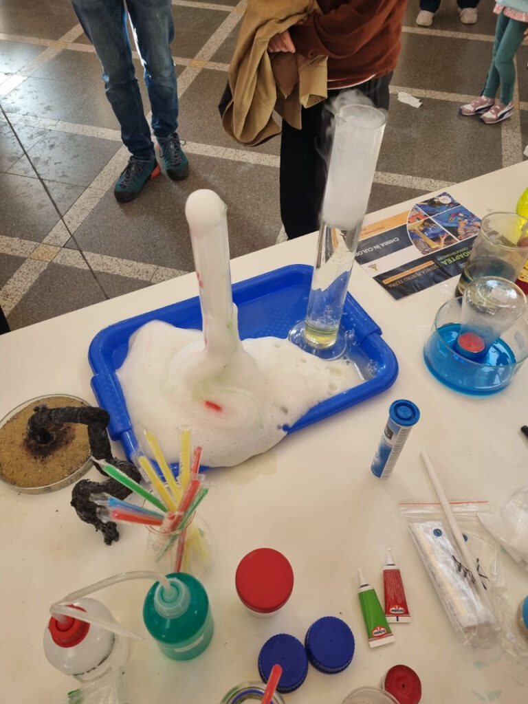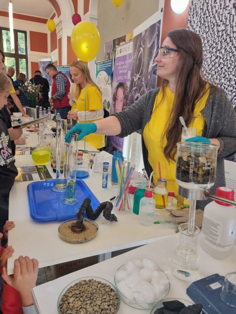În Parcul Central, la CASINO Centrul de Cultură Urbană – Cluj-Napoca, echipa INCDTIM a răspuns pozitiv invitației de a participa la evenimentul “Noaptea Cercetătorilor ReCoNnect” (ReCoNnect 3 – Building a Community, proiect HORIZON-MSCA-2023-CITIZENS-01). Echipa INCDTIM (foto stânga) a reprezentat un pion cheie la acest eveniment, participând cu ateliere de învățare prin demonstrații și seminare interactive: experimente de purificare/curățare a apelor prin filtrare, vulcanul, apa plimbăreață-curcubeu într-un pahar; șarpele de zahăr; borcanul cu lavă; bateria din salată de fructe; zeama de varză și superputerea ei; experimente explozive cu bicarbonat; tornadă în sticlă; pasta de dinți a elefantului; crearea de circuite electrice cu baterii; experimente despre/cu polarizarea luminii, holograme prin reflexia luminii, instrumente muzicale realizate din diverse obiecte, și, nu ȋn ultimul rând, prezentarea azotului lichid.